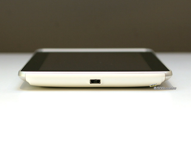 ▲HTC Flyer 在機身底部配置一個 microUSB 都可以輸出的插槽,若要使用 HDMI 輸出功能的話,還需要在此接上一條轉接線。白色保護蓋底下,則是安裝 SIM 卡 & microSD 卡的地方。